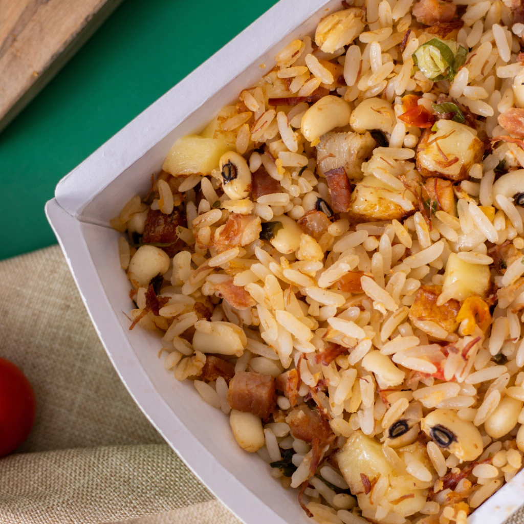 INGREDIENTES: Arroz parboilizado, feijão fradinho, bacon, carne seca, queijo coalho, tomate, cebola, manteiga ghee, alho, sal rosa, azeite de oliva, páprica, coentro, pimenta do reino.